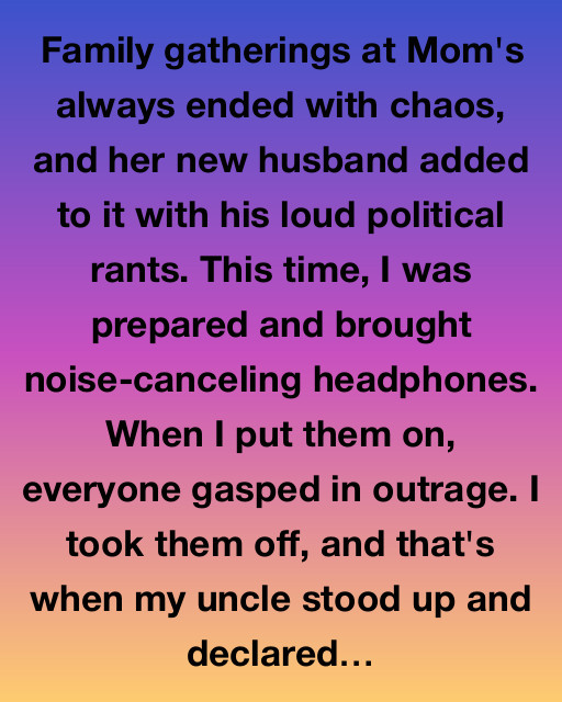 Family gatherings at Mom’s always ended with chaos, and her new husband added to it with his loud political rants. This time, I was prepared and brought noise-canceling headphones. When I put them on, everyone gasped in outrage. I took them off, and that’s when my uncle stood up and declared his own annoyance at the way our gatherings had devolved. He pointed out the awkward silence that seemed to blanket the room like a thick fog.