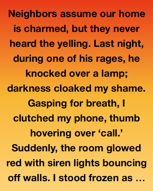 Neighbors assume our home is charmed, but they never heard the yelling. Last night, during one of his rages, he knocked over a lamp; darkness cloaked my shame. Gasping for breath, I clutched my phone, thumb hovering over โcall.โ Suddenly, the room glowed red with siren lights bouncing off walls. I stood frozen as police officers cautiously approached our door, their silhouettes stark against the flashing lights.