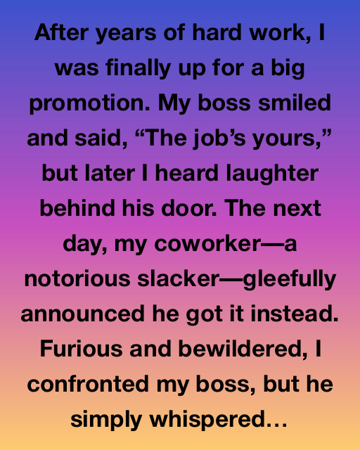 After years of hard work, I was finally up for a big promotion. My boss smiled and said, โThe jobโs yours,โ but later I heard laughter behind his door. The next day, my coworkerโa notorious slackerโgleefully announced he got it instead. Furious and bewildered, I confronted my boss, but he simply whispered, โSometimes things happen that we donโt understand at first.โ I walked out of his office, my mind spinning with confusion and anger.
