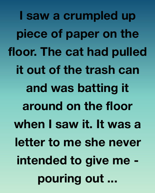 I saw a crumpled up piece of paper on the floor. The cat had pulled it out of the trash can and was batting it around on the floor when I saw it. It was a letter to me she never intended to give me – pouring out feelings she had buried for years.