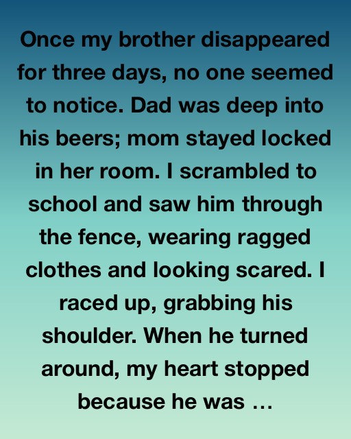 Once my brother disappeared for three days, no one seemed to notice. Dad was deep into his beers; mom stayed locked in her room. I scrambled to school and saw him through the fence, wearing ragged clothes and looking scared. I raced up, grabbing his shoulder. When he turned around, my heart stopped because he was shivering and looked more like a stranger than my brother.