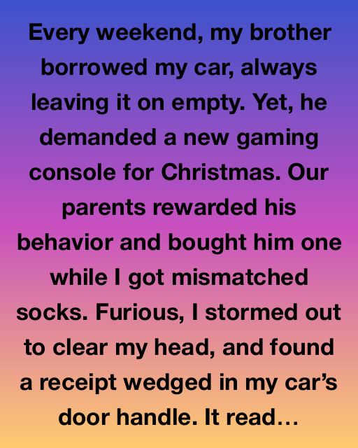 Every weekend, my brother borrowed my car, always leaving it on empty. Yet, he demanded a new gaming console for Christmas. Our parents rewarded his behavior and bought him one while I got mismatched socks. Furious, I stormed out to clear my head and found a receipt wedged in my carโs door handle. It read four unlock attempts for karaoke tickets on December 22nd, a date I didnโt recall attending any event.