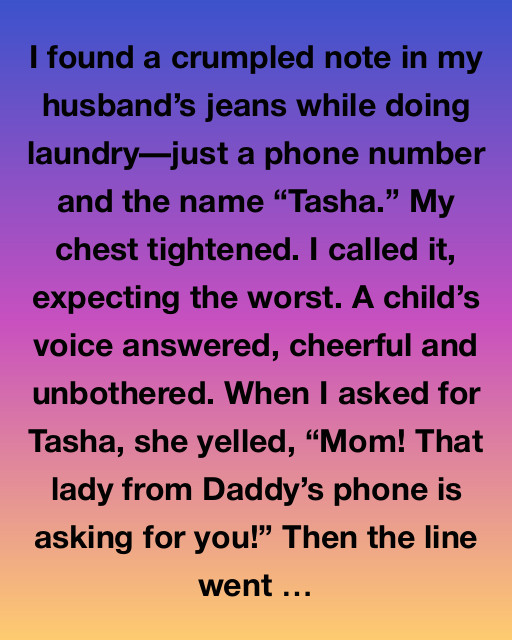 I found a crumpled note in my husband’s jeans while doing laundry—just a phone number and the name “Tasha.” My chest tightened. I called it, expecting the worst. A child’s voice answered, cheerful and unbothered. When I asked for Tasha, she yelled, “Mom! That lady from Daddy’s phone is asking for you!” Then the line went silent.