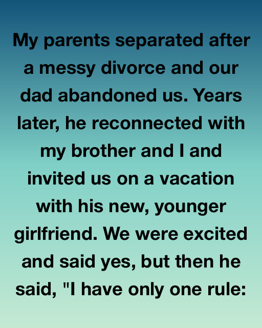 My parents separated after a messy divorce and our dad abandoned us. Years later, he reconnected with my brother and I and invited us on a vacation with his new, younger girlfriend. We were excited and said yes, but then he said, “I have only one rule: don’t talk about the past.”