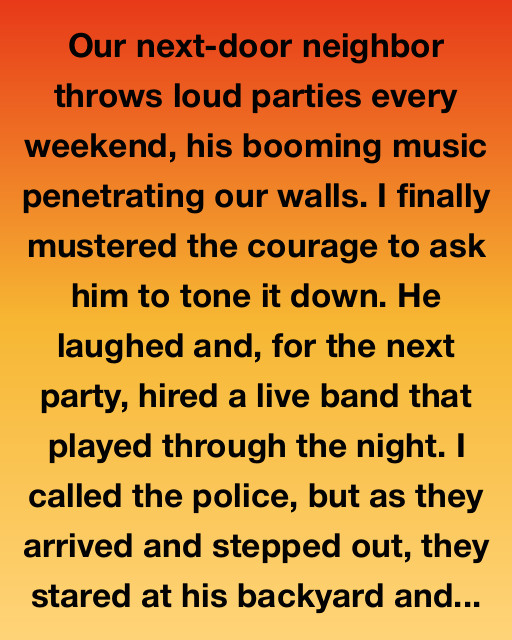 Our next-door neighbor throws loud parties every weekend, his booming music penetrating our walls. I finally mustered the courage to ask him to tone it down. He laughed and, for the next party, hired a live band that played through the night. I called the police, but as they arrived and stepped out, they stared at his backyard and saw the crowd was much larger than expected.