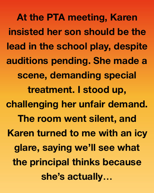 At the PTA meeting, Karen insisted her son should be the lead in the school play, despite auditions pending. She made a scene, demanding special treatment. I stood up, challenging her unfair demand. The room went silent, and Karen turned to me with an icy glare, saying we’ll see what the principal thinks because she’s actually the principal’s sister-in-law.