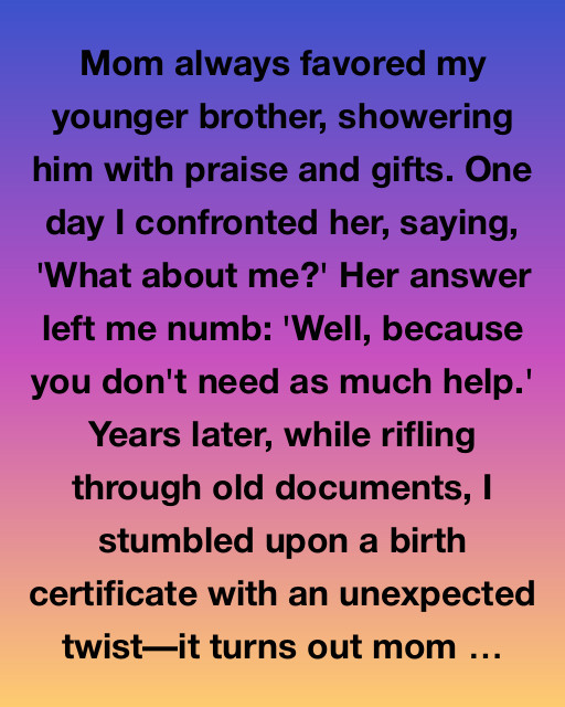 Mom always favored my younger brother, showering him with praise and gifts. One day I confronted her, saying, ‘What about me?’ Her answer left me numb: ‘Well, because you don’t need as much help.’ Years later, while rifling through old documents, I stumbled upon a birth certificate with an unexpected twistโit turns out mom was not my biological mother.