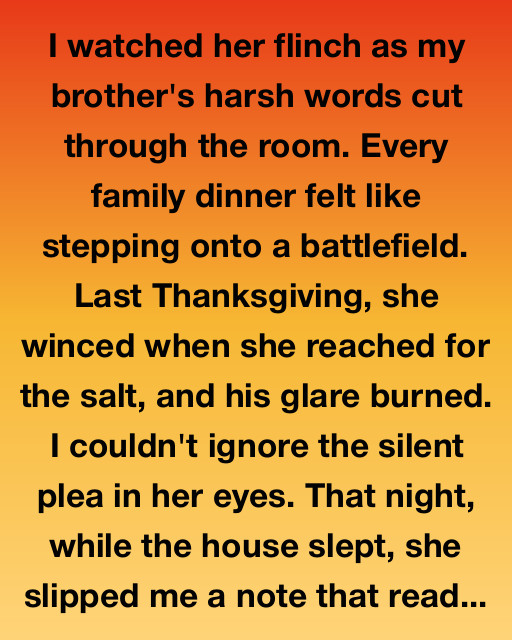 I watched her flinch as my brother’s harsh words cut through the room. Every family dinner felt like stepping onto a battlefield. Last Thanksgiving, she winced when she reached for the salt, and his glare burned. I couldn’t ignore the silent plea in her eyes. That night, while the house slept, she slipped me a note that read, “Help me.”