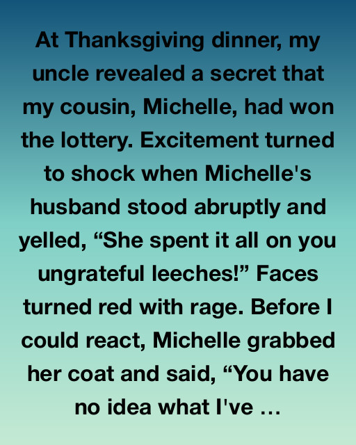 At Thanksgiving dinner, my uncle revealed a secret that my cousin, Michelle, had won the lottery. Excitement turned to shock when Michelle’s husband stood abruptly and yelled, “She spent it all on you ungrateful leeches!” Faces turned red with rage. Before I could react, Michelle grabbed her coat and said, “You have no idea what I’ve been through.”