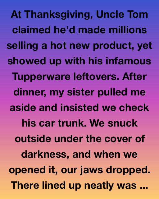 At Thanksgiving, Uncle Tom claimed he’d made millions selling a hot new product, yet showed up with his infamous Tupperware leftovers. After dinner, my sister pulled me aside and insisted we check his car trunk. We snuck outside under the cover of darkness, and when we opened it, our jaws dropped. There lined up neatly was an assortment of handmade candles, crafted with intricate designs and delightful scents, and my sister gasped.