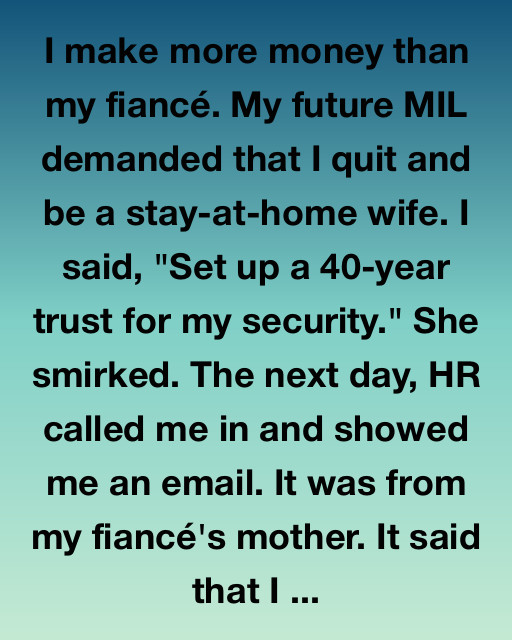 I make more money than my fiancรฉ. My future MIL demanded that I quit and be a stay-at-home wife. I said, ‘Set up a 40-year trust for my security.’ She smirked. The next day, HR called me in and showed me an email. It was from my fiancรฉ’s mother. It said that I was mentally unstable, potentially a risk to clients, and they should consider letting me go quietly.