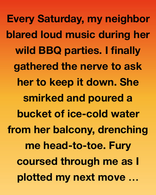 Every Saturday, my neighbor blared loud music during her wild BBQ parties. I finally gathered the nerve to ask her to keep it down. She smirked and poured a bucket of ice-cold water from her balcony, drenching me head-to-toe. Fury coursed through me as I plotted my next move.
