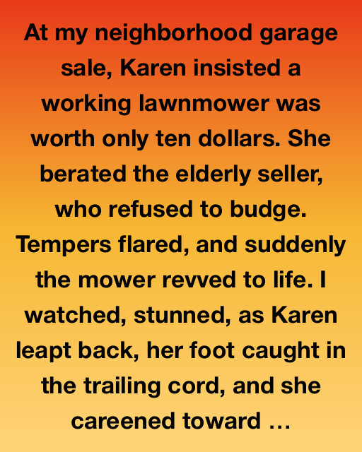 At my neighborhood garage sale, Karen insisted a working lawnmower was worth only ten dollars. She berated the elderly seller, who refused to budge. Tempers flared, and suddenly the mower revved to life. I watched, stunned, as Karen leapt back, her foot caught in the trailing cord, and she careened toward a pile of donated clothes. Her shocked expression turned to relief as she landed softly on the stacked garments.