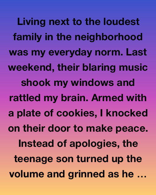 Living next to the loudest family in the neighborhood was my everyday norm. Last weekend, their blaring music shook my windows and rattled my brain. Armed with a plate of cookies, I knocked on their door to make peace. Instead of apologies, the teenage son turned up the volume and grinned as he playfully swayed to the rhythm.