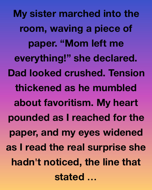 My sister marched into the room, waving a piece of paper. “Mom left me everything!” she declared. Dad looked crushed. Tension thickened as he mumbled about favoritism. My heart pounded as I reached for the paper, and my eyes widened as I read the real surprise she hadn’t noticed, the line that stated a condition that would change everything.