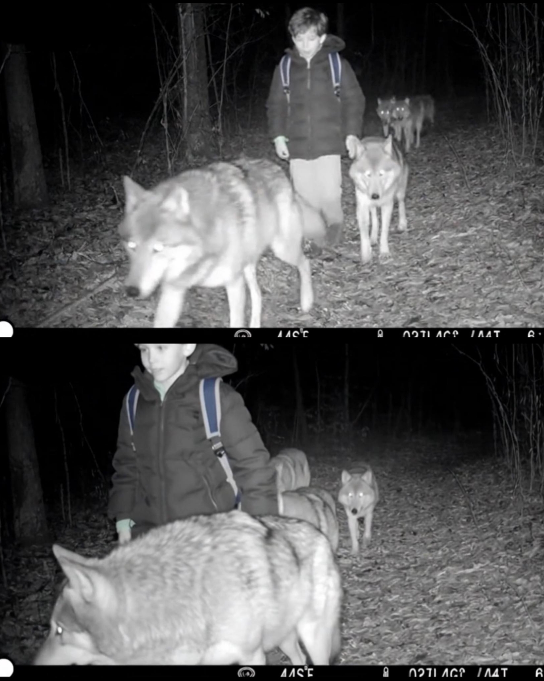 No one believed him — until a week later, a hunter’s game camera revealed the truth: the boy walking between two wolves, one leading, one guarding behind.