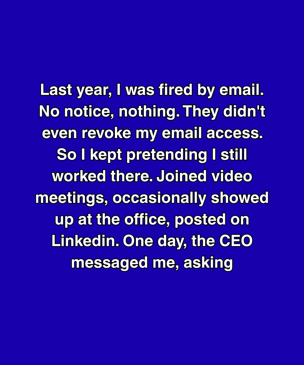 No notice, nothing. They didn’t even revoke my email access. So I kept pretending I still worked there. Joined video meetings, occasionally showed up at the office, posted on LinkedIn. One day, the CEO messaged me, asking: