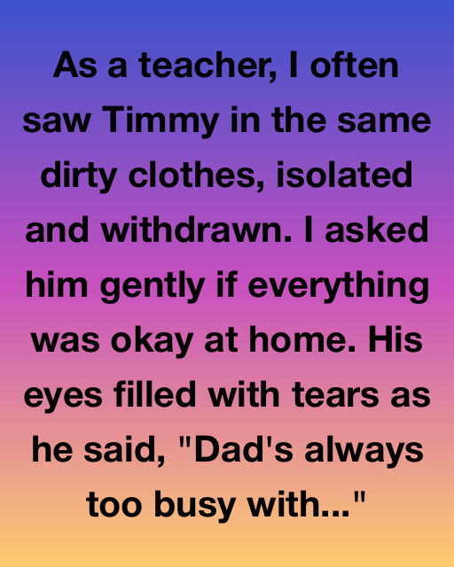 As a teacher, I often saw Timmy in the same dirty clothes, isolated and withdrawn. I asked him gently if everything was okay at home. His eyes filled with tears as he said, “Dad’s always too busy with work to notice me.”