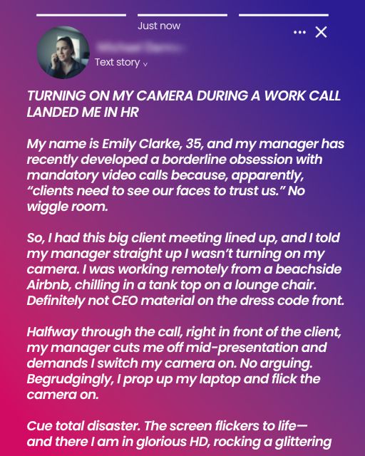 Name’s Emily Clarke, 35, and my manager has recently developed a borderline obsession with mandatory video calls because, apparently, “clients need to see our faces to trust us.” No wiggle room.
