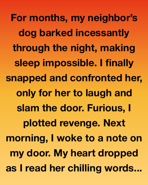 For months, my neighbor’s dog barked incessantly through the night, making sleep impossible. I finally snapped and confronted her, only for her to laugh and slam the door. Furious, I plotted revenge. Next morning, I woke to a note on my door. My heart dropped as I read her chilling words — “You have no idea what goes on here at night.”
