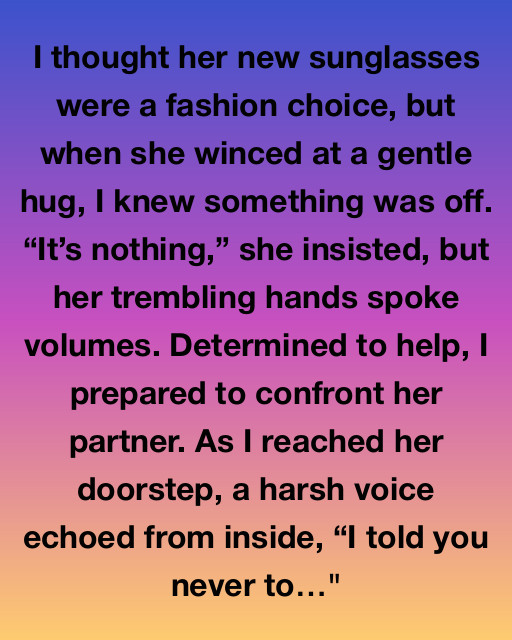 I thought her new sunglasses were a fashion choice, but when she winced at a gentle hug, I knew something was off. “It’s nothing,” she insisted, but her trembling hands spoke volumes. Determined to help, I prepared to confront her partner. As I reached her doorstep, a harsh voice echoed from inside, “I told you never to speak to anyone about our business!”