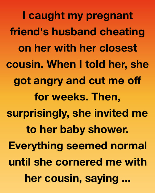 I caught my pregnant friend’s husband cheating on her with her closest cousin. When I told her, she got angry and cut me off for weeks. Then, surprisingly, she invited me to her baby shower. Everything seemed normal until she cornered me with her cousin, saying, “So… tell me again exactly what you think you saw?”