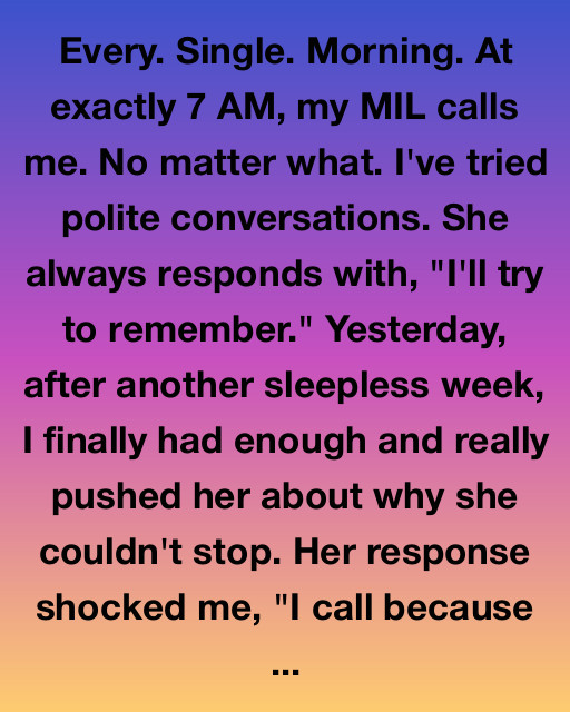 Every. Single. Morning. At exactly 7 AM, my MIL calls me. No matter what. I’ve tried polite conversations. She always responds with, “I’ll try to remember.” Yesterday, after another sleepless week, I finally had enough and really pushed her about why she couldn’t stop. Her response shocked me, “I call because I donโt want to feel like Iโve lost another son.โ